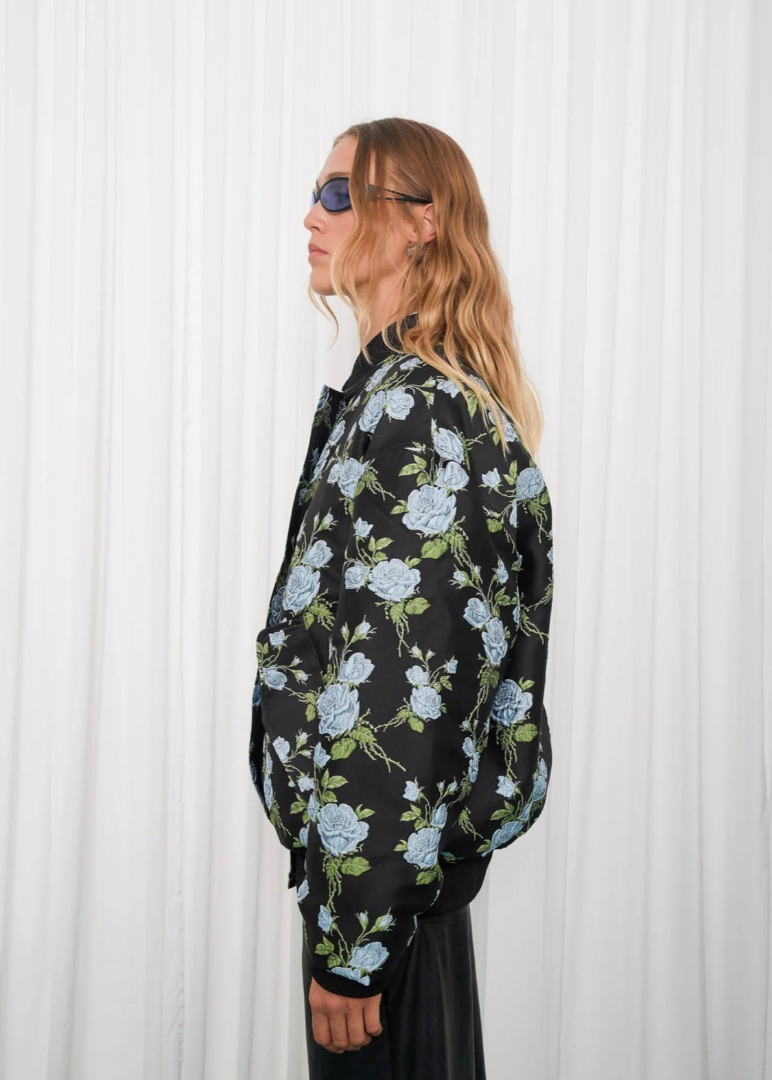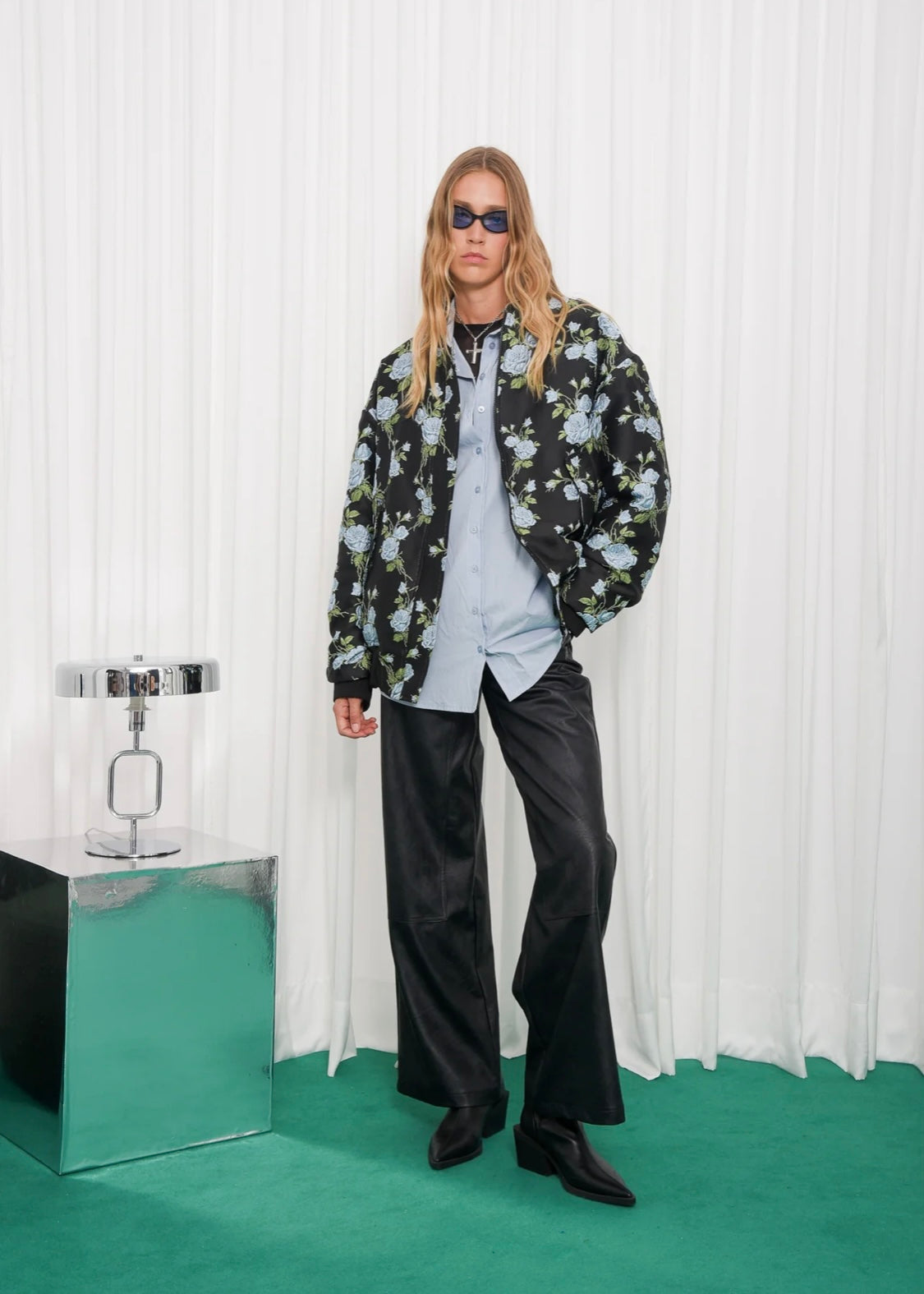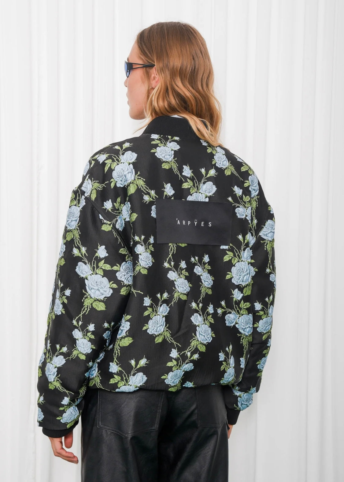 The More jacket combines bold style with a relaxed silhouette. Crafted from structured jacquard fabric with an all-over light blue floral pattern, it features a zip-up front, ribbed trims, and side pockets. Detailed with the "ARPYES" logo patch on the back, it offers warmth, comfort, and a statement finish for any look.