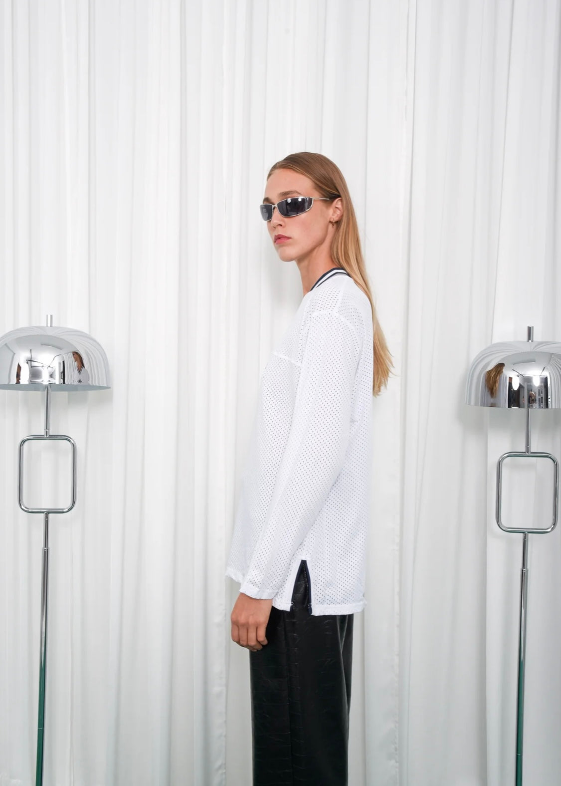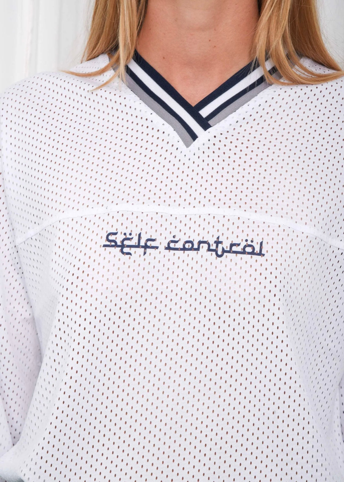 The Self Control long sleeve mesh blouse is made from lightweight white mesh with a breathable perforated texture. It features a sporty V-neckline with striped trim in navy and grey, and a “Self Control” stamp on the chest. With long sleeves, side slits, and a relaxed fit, it’s perfect for layering or wearing solo.
