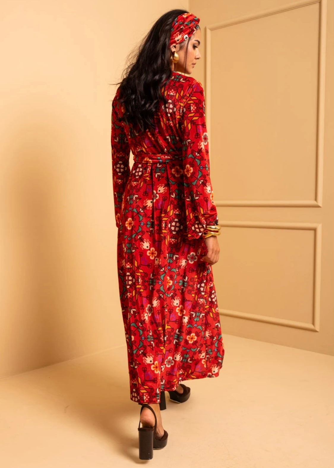 Το ύφασμα βελουτέ αγκαλιάζει το σώμα με απαλότητα, ενώ το μήκος περίπου 1,30μ. δίνει κομψή παρουσία σε κάθε σου βήμα.