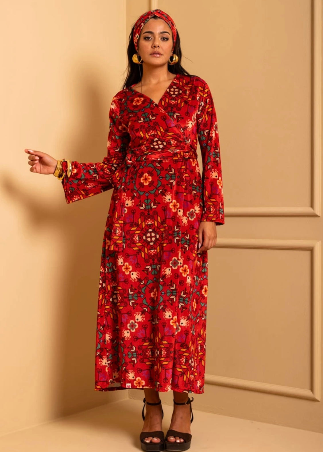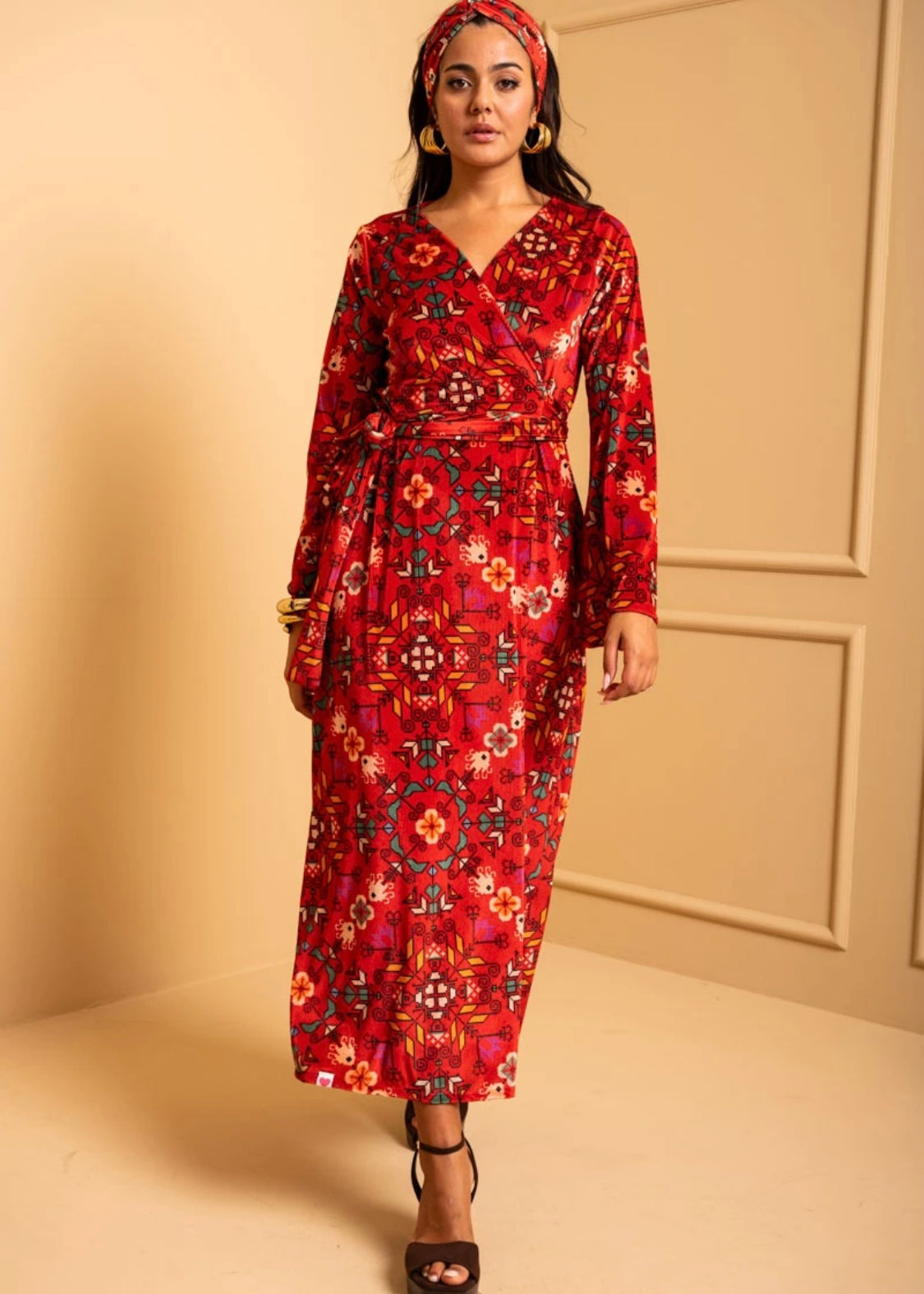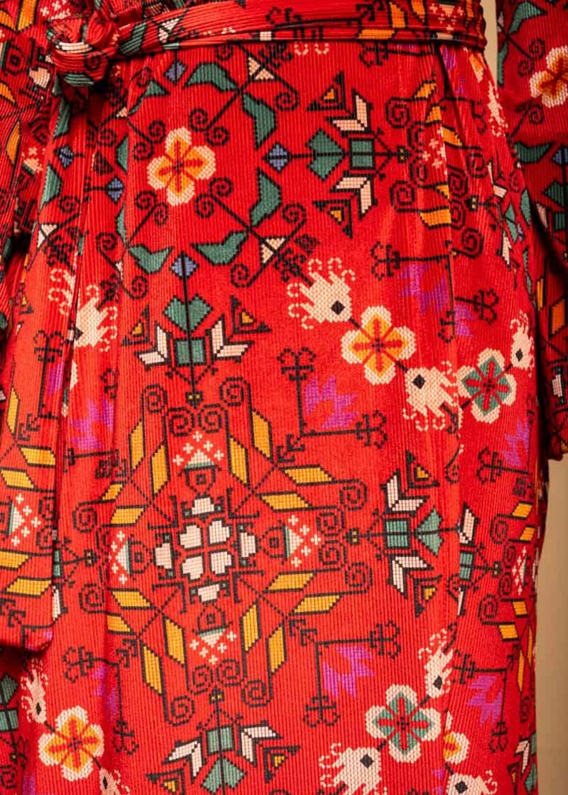 Iris Wrap Dress Red Terracotta Folk Pixel Flower Βελούδινο Rip Φόρεμα Κρουαζέ Petit Boutik