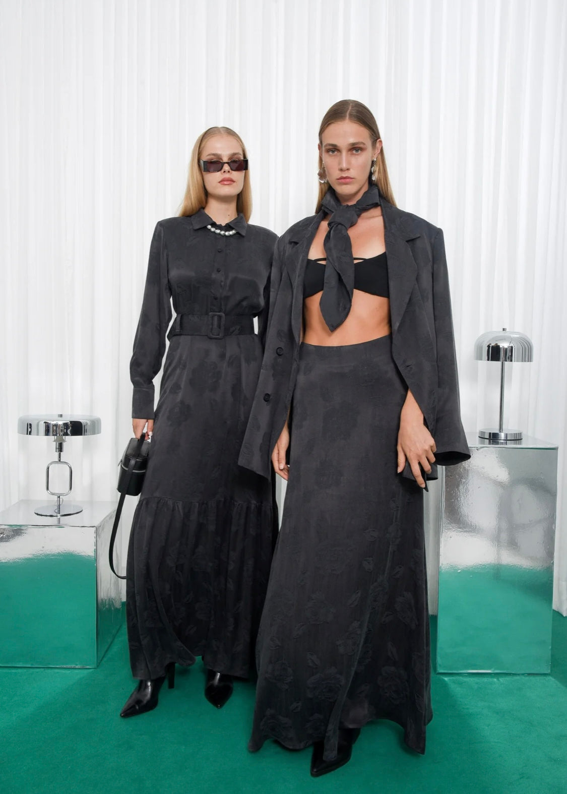 Inner Voice scarf, a lightweight black jacquard scarf with a soft feel and subtle floral pattern. Its fluid drape makes it easy to wear around the neck, shoulders, or as a stylish accessory for any look.
