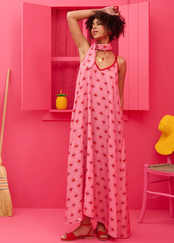 Beverly Short Dress Vis Pink Strawberries Τιραντέ Φόρεμα με Ζώνη & Τσέπες Petit Boutik